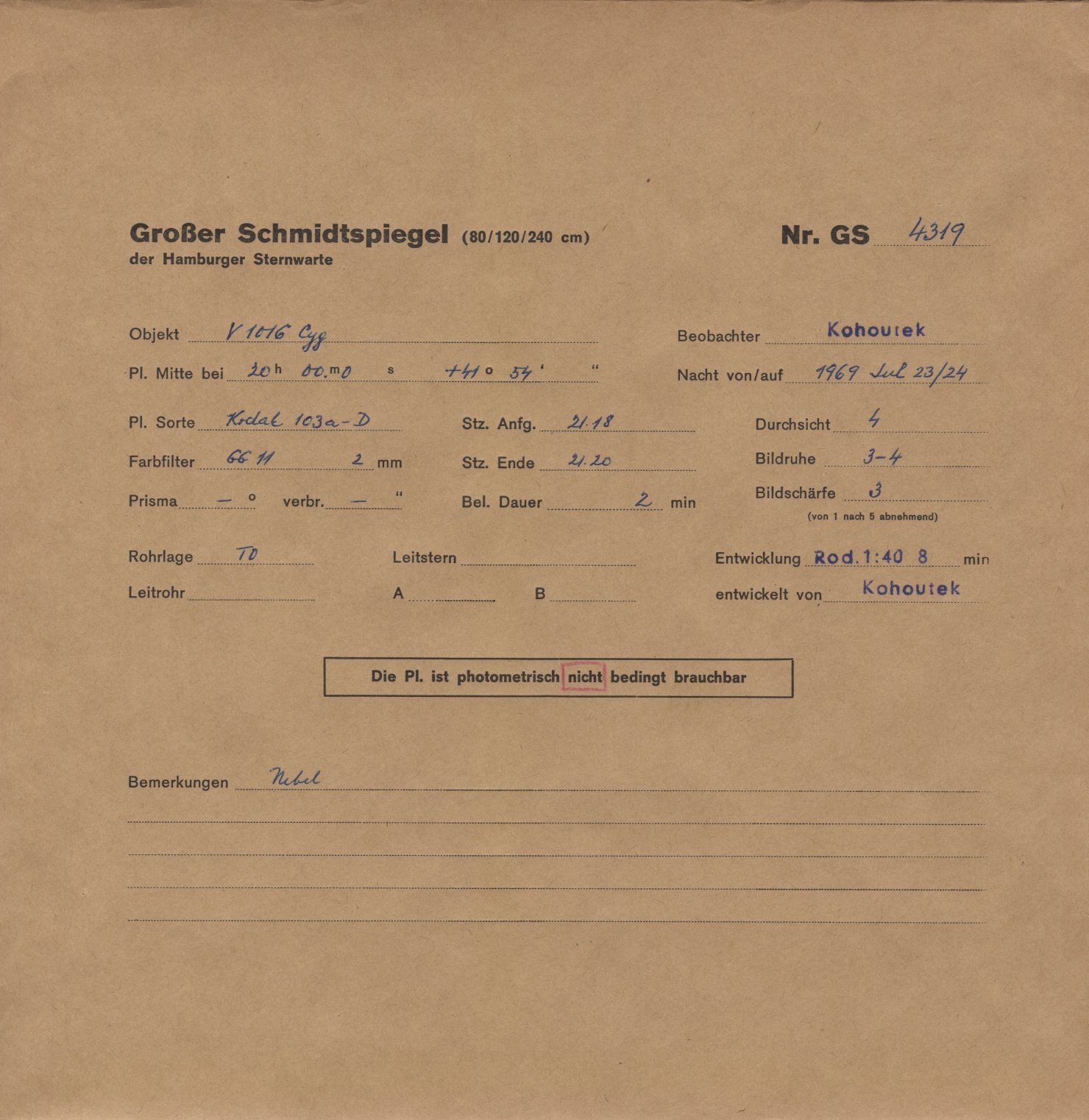 Großer-Schmidt-Spiegel: GS04319 -- V 1016 Cyg -- 20:00.0 +41:54.0
