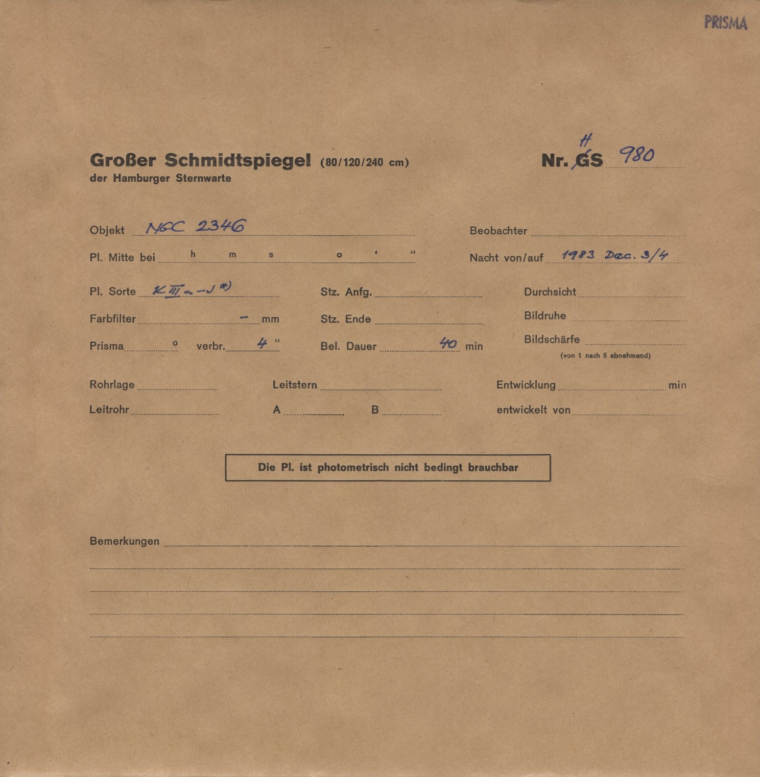 Norden = links, Osten = unten, falls nicht auf der Fotoplatte anders beschriftet