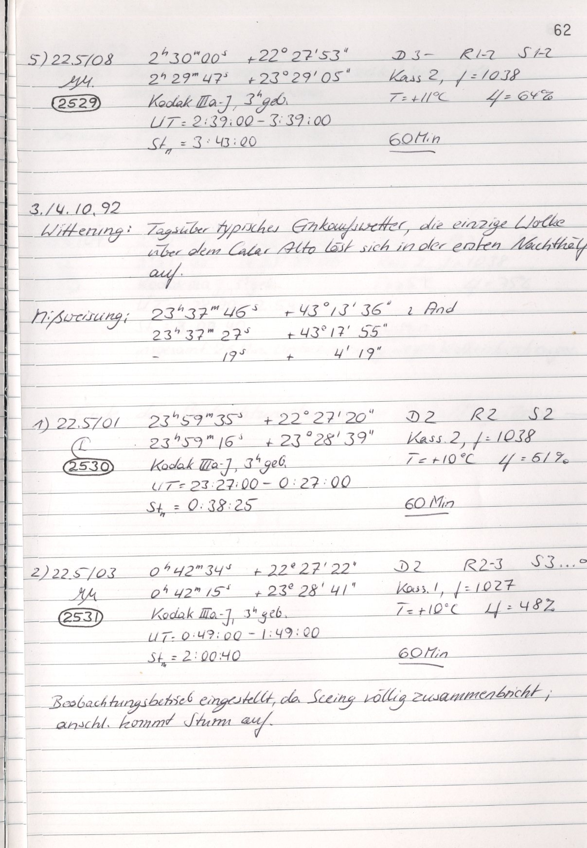 Zum Datum gehörende Seiten des Beobachtungsbuches