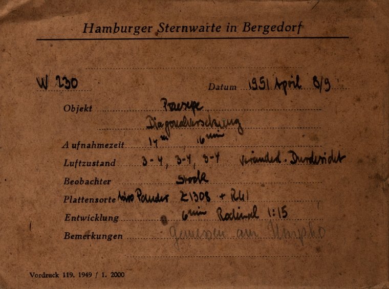 The material in this archive can be used for scientific purposes free of charge. Any other usage requires the written permission of the director of Hamburger Sternwarte.