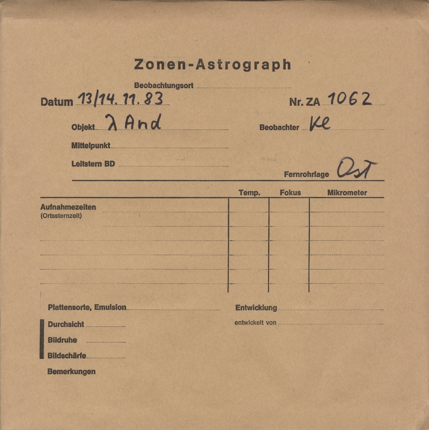 Norden = oben, Osten = links, falls nicht auf der Fotoplatte anders beschriftet